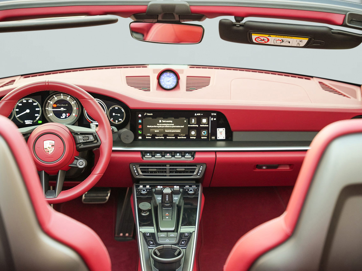 The interior is a luxurious blend of sport and sophistication, featuring fine leather upholstery, carbon-fiber trim, and customizable details. The driver-centric cockpit includes the latest Porsche Communication Management (PCM) system with a 10.9-inch touchscreen, Apple CarPlay®, Android Auto™, and an optional Burmester® 3D High-End Surround Sound System for an immersive audio experience.